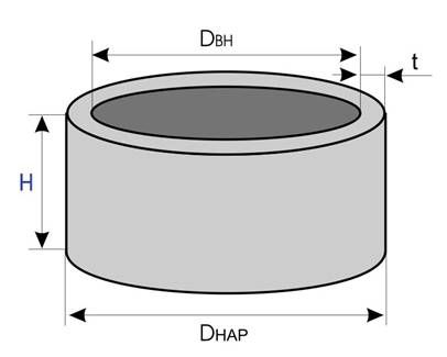 | Маркировка | Наружный диаметр, мм (Dнар) | Внутренний диаметр, мм (Dвн) | Высота, мм (H) | Толщина стенки, мм (t) | Масса, т (m) |